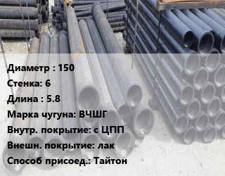 Труба чугунная 150 s=6 L=5.8 Чугун:ВЧШГ с ЦПП *лак Тайтон, шт цена от 17 085 ₽ / шт, где купить, условия доставки в Нижнем Новгороде и Нижегородской области