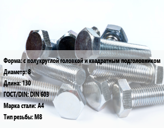 Болт с полукруглой головкой и квадратным подголовником 8х130 DIN 603 Сталь: А4 М8, цену уточнять, кг цена от 15.3 ₽ / кг, где купить, условия доставки в Нижнем Новгороде и Нижегородской области