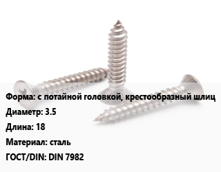 Саморез с потайной головкой, крестообразный шлиц D=3.5 L=18 сталь ГОСТ: DIN 7982