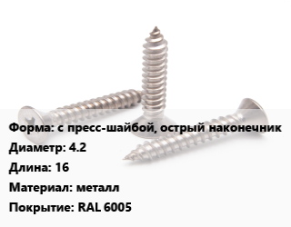 Саморез с пресс-шайбой, острый наконечник D=4.2 L=16 металл RAL 6005, шт цена По запросу где купить, условия доставки в Нижнем Новгороде и Нижегородской области