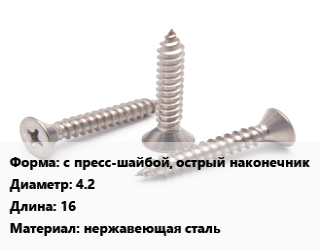 Саморез с пресс-шайбой, острый наконечник D=4.2 L=16 нержавеющая сталь, шт, А2 цена от 5.04 ₽ / кг, где купить, условия доставки в Нижнем Новгороде и Нижегородской области