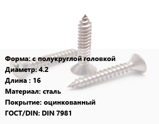 Саморез с полукруглой головкой D=4.2 L=16 сталь оцинкованный ГОСТ: DIN 7981