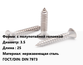 Саморез с полупотайной головкой D=3.5 L=25 нержавеющая сталь ГОСТ: DIN 7973