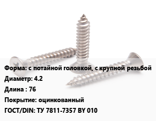 Саморез с потайной головкой, с крупной резьбой D=4.2 L=76 оцинкованный ГОСТ: ТУ 7811-7357 BY 010