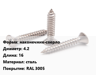 Саморез наконечник-сверло D=4.2 L=16 сталь RAL 3005, упаковка 1000 шт, для металла цена от 602.27 ₽ / кг, где купить, условия доставки в Нижнем Новгороде и Нижегородской области