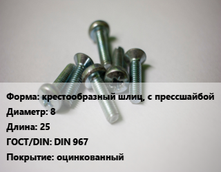 Винт крестообразный шлиц, с прессшайбой 8х25 DIN 967 оцинкованный