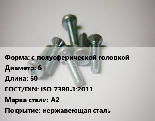 Винт с полусферической головкой 6х60 ISO 7380-1:2011 Сталь: A2 нержавеющая сталь, цена за шт, кг цена от 39.6 ₽ / кг, где купить, условия доставки в Нижнем Новгороде и Нижегородской области