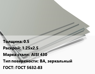 Лист нержавеющий 0.5 1.25х2.5 Сталь: AISI 430 Тип:BA, зеркальный ГОСТ 5632-83, шт, в пленке цена от 2 982 ₽ / т, где купить, условия доставки в Нижнем Новгороде и Нижегородской области