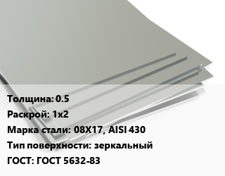 Лист нержавеющий 0.5 1х2 Сталь: 08Х17, AISI 430 Тип:зеркальный ГОСТ 5632-83, х/к, в бумаге,в пленке цена от 185 107 ₽ / т, где купить, условия доставки в Нижнем Новгороде и Нижегородской области