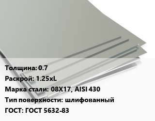 Лист нержавеющий 0.7 1.25хL Сталь: 08Х17, AISI 430 Тип:шлифованный ГОСТ 5632-83