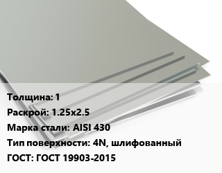 Лист нержавеющий 1 1.25х2.5 Сталь: AISI 430 Тип:4N, шлифованный ГОСТ 19903-2015