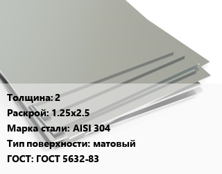 Лист нержавеющий 2 1.25х2.5 Сталь: AISI 304 Тип:матовый ГОСТ 5632-83