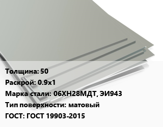 Лист нержавеющий 50 0.9х1 Сталь: 06ХН28МДТ, ЭИ943 Тип:матовый ГОСТ 19903-2015